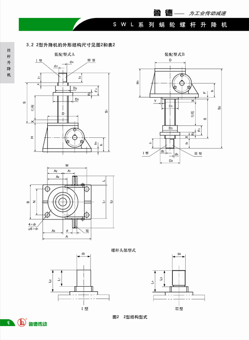 SWL蝸輪螺桿升降機規格型號有2.5T、5T、10T、15T、20T、25T、35T、50T、100、120T十種。結構型式分為:蝸輪與螺桿為螺紋聯接,螺桿作軸向運動型;蝸輪與螺桿為鍵聯接,螺桿上配螺母,螺桿上的螺母作軸向運動兩種型式。有不同的裝配型式和絲桿頭部形式可選,速比有普通速比和慢速比兩種。