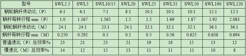 蝸輪絲桿升降機的速比有快速和慢速兩種,快速普通速比(P)為6:1,每分鐘行走速度為1670mm;慢速為24:1,每分鐘行走400mm。在同一個型號下的絲桿升降機,普通速比的傳動要比慢速的小,蝸桿的每轉要比慢速的長一些,慢速的絲桿升降機在總效率上比不上普通速比的